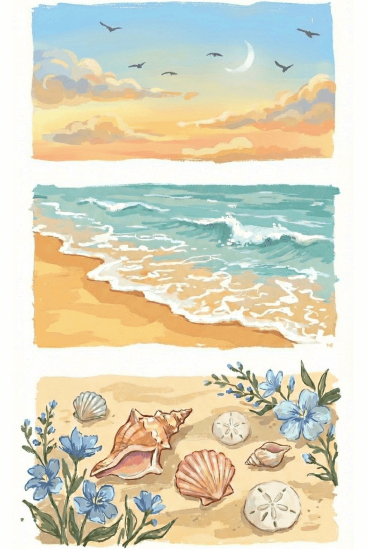 A soft, breezy escape in notebook form — pastel skies, gentle waves, and dreamy calm. 🌅🌤️🍃